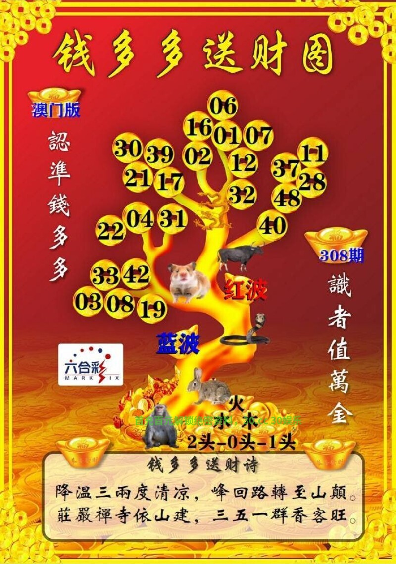 308期:【钱多多送财诗】 降温三两度清凉,峰回路转至山颠。庄严禅寺依山建,三五一群香客旺。 综合六肖:龙牛鼠蛇兔猴 |